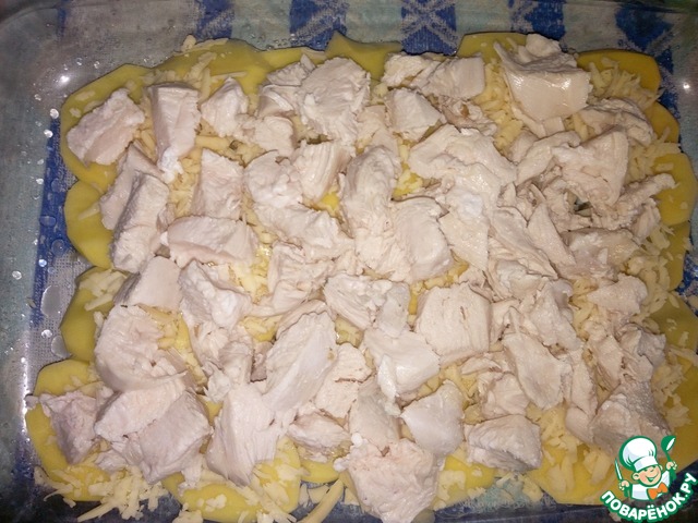 Укладываем картофель так как показано на фото. Следующий слой делаем из сыра.
