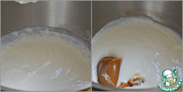 Не переставая взбивать, по ложке, добавить вареное сгущенное молоко. -
