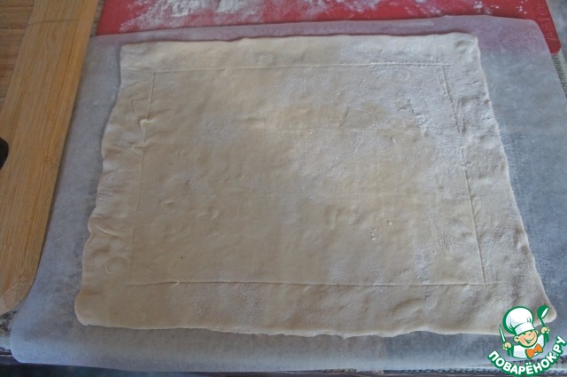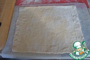 Раскатать тесто в прямоугольник толщиной с монетку. Очертить бортик, отступив от краев около 2 см.