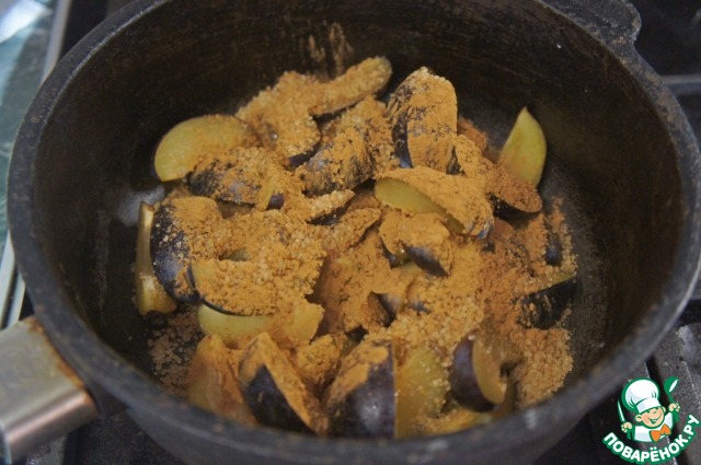 Выложить на сковороду вместе с сахаром и корицей. Готовить 5 минут на сильном огне, постоянно перемешивая, пока сливы не закарамелизуются.