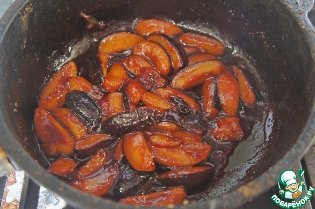 Сверху выложить сливы. Полить образовавшимся сиропом.