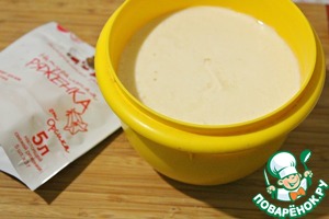 Добавить в емкость для приготовления 1 пакетик закваски, влить топленое молоко.