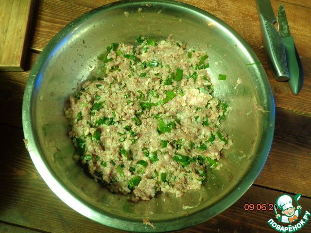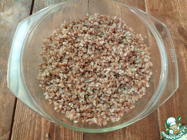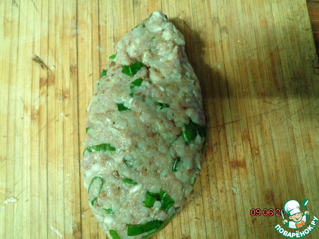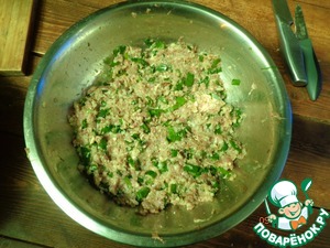 Для основы соединить мясной фарш, гречневую кашу, порезанный зеленый лук, соль, измельченный чеснок, приправу.