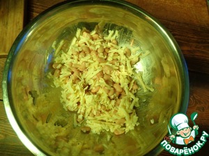 Приготовить начинку: с консервированной фасоли слить жидкость и соединить фасоль с нашинкованным сыром.