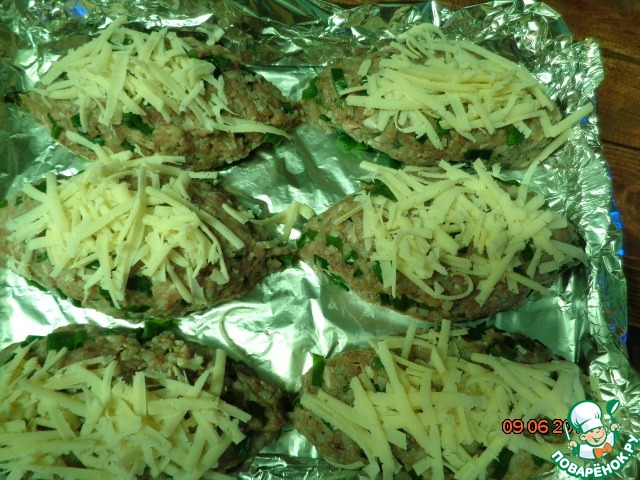 Противень смазать растительным маслом и разложить получившиеся изделия. Для создания аппетитной корочки сверху на зразы положить нашинкованный сыр.