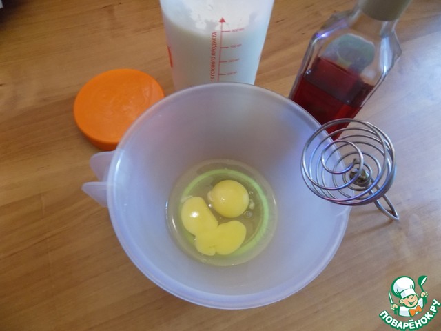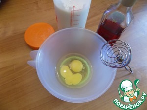 Делаем заливку для тефтелей, пока те стоят в духовке. Разбиваем в посуду яйца, наливаем винный уксус, солим и венчиком соединяем. Выкладываем йогурт.