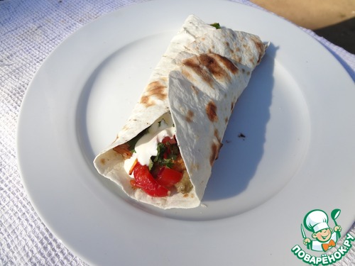 , добавляем масло при необходимости. Индейка должна полностью прожариться, а овощи должны слегка хрустеть. Наша начинка пожарилась, отлично уберем ее пока в сторону и займемся соусом - гуакамоле. Тут все очень просто - авокадо должен быть спелым и мягким, разрезаем пополам, вынимаем косточку и вырезаем мякоть при помощи обычной ложки. Блендером или вилкой наминаем в тарелке мякоть авокадо с мякотью от помидор, и выдавливаем туда чеснок и сок одного лайма. Перемешиваем - соус готов. Нарезаем кубиками свежий помидор и огурец, красный лук и сдабриваем соком лайма, солим по вкусу - эта штука называется Сальса, все пойдет тоже в начинку для придания свежести во вкусе. Лаваш можно слегка прижарить на сковороде, чтобы он стал чуть жестче, а можно этого и не делать. На лаваш намазываем гуакамоле, далее кладем нашу поджарку, сверху насыпаем немного сальсы, перец чили при желании и пару ложек сметаны. Сворачиваем лаваш, как у меня на картинке и пробуем - вкусно, остро и свежо.
