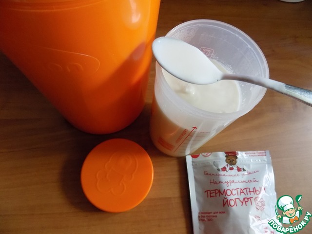 Термостатный йогурт сделала по инструкции на упаковке ТМ Oursson на козьем молоке. Можно сказать, что получился греческий йогурт. Делала на ночь в специальном термосе той же марки, что и закваска и на утро получился замечательный кисломолочный натуральный продукт.
