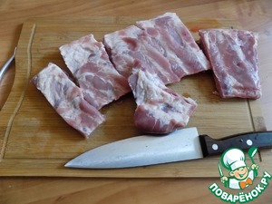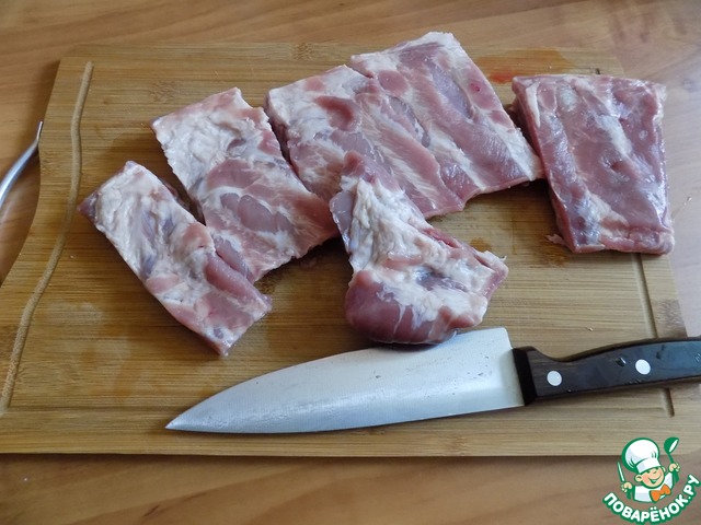 Взяла охлаждённые свиные рёбра 800 г. Помыла их и обсушила бумажным полотенцем и нарезала на куски по 2-3 ребра.