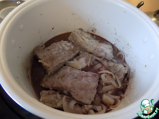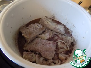 Положила маринад из под рёбер йогуртовый и залила красным вином. Перемешала и выставила режим тушения на 1 час.