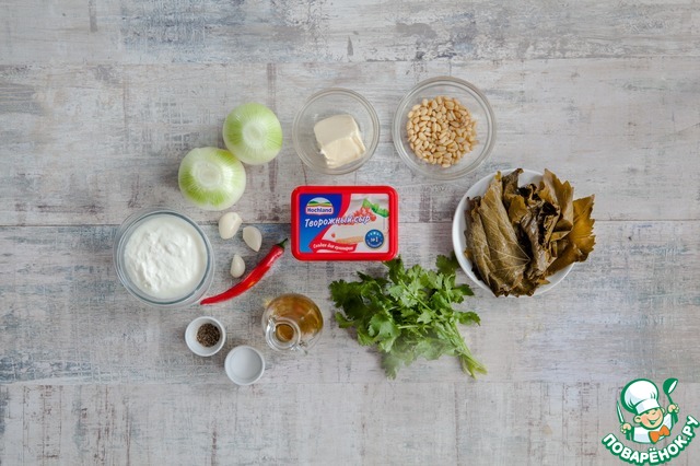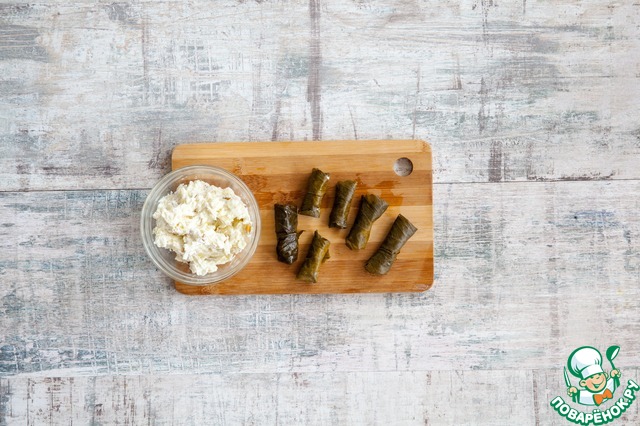Расстилайте перед собой на рабочей поверхности виноградный лист гладкой стороной вниз, основанием (там, где был стебель) к себе. Выкладывайте по центру, около основания, ложечку сырной начинки. Сворачивайте в плотный рулетик, подворачивая открытые края. Дайте долме настояться в холодильнике примерно 1 ч и подавайте с соусом из мацони, присыпав соус, при желании, острым перцем.