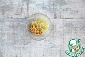Добавьте к орехам и луку творожный сыр и оливковое масло, посолите, поперчите, перемешайте.
