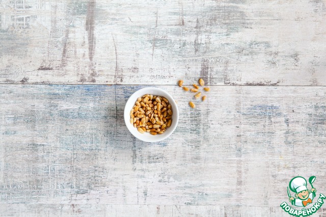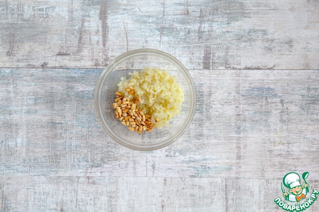 В той же сковороде растопите масло, положите лук, посолите, обжаривайте до золотисто-коричневого цвета, примерно 12 мин. Переложите обжаренный лук к кедровым орехам.