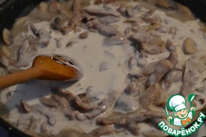 Добавляем сметану. Опять доводим до кипения, убавляем огонь и тушим до готовности мяса. -