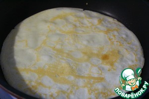 Жарим тонкие блинчики на сильно разогретой сковороде, с двух сторон.