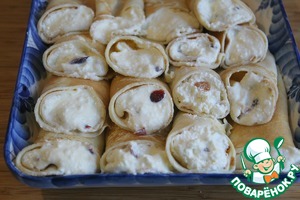 Выкладываем часть начинки на блинчик и сворачиваем рулетом - нужно распределить начинку по всему блинчику и потом свернуть. Я же выкладывала на одну сторону блинчика начинку и сворачивала-это очень неудобно! -