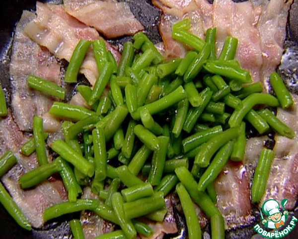 Влить немного оливкового масла, выложить предварительно отваренную стручковую фасоль.