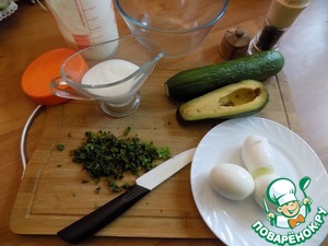 Для салата яйца варим вкрутую. Готовим всё, что пригодится. Авокадо разрезаем и вынимаем косточку, сбрызгиваем лимонным соком, чтобы быстро не потемнело. Ещё я для этого использую керамический нож, от обычного оно быстро темнеет. Зелень мелко рубим. В соусник помещаем йогурт. Йогурт на козьем молоке у меня получился почки греческий.