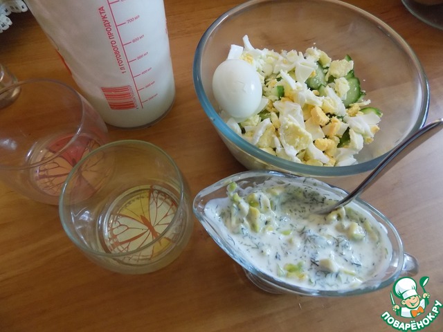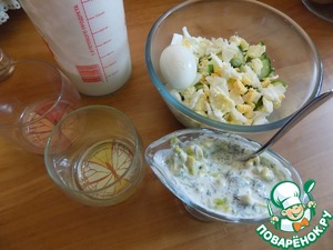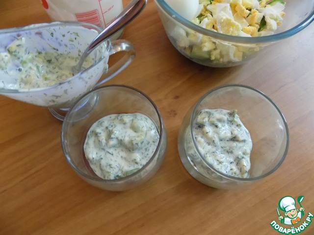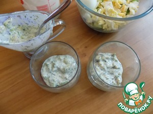 Огурец и два яйца режем произвольно, перемешиваем. Одно яйцо оставляем для подачи. Я буду подавать каждому индивидуально салат в стаканах. На дно стаканов выкладываем слой заправки ~ по 1 ст л.