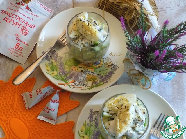 Салат из свежего огурца и яйца, заправлен заправкой из домашнего термостатного йогурта, сделанного из закваски Oursson для йогурта, авокадо, укропа и зелёного лука. Замечательное сочетание продуктов. Салат простой, но очень вкусный.