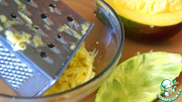 Манго натираем на крупной терке или режем мелкими кубиками. Я уже писала, но повторюсь, что как вариант манго можно заменить на морковь, зеленое яблоко или огурец. Но будет более прозаично.