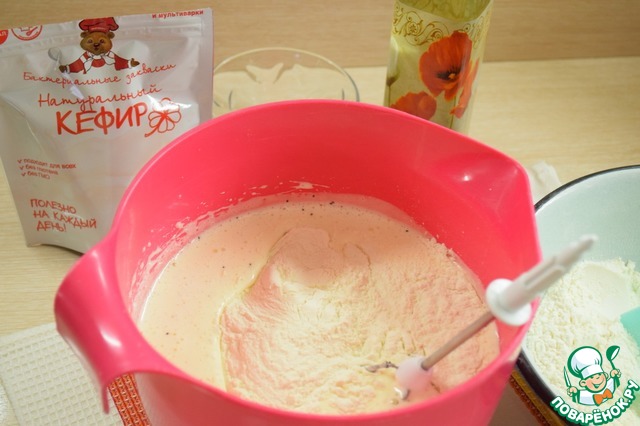 В отдельной емкости смешать соду и горчичный порошок, залить крутым кипятком, перемешать. Сразу вылить в тесто и хорошо перемешать.
