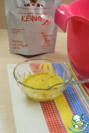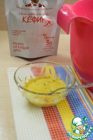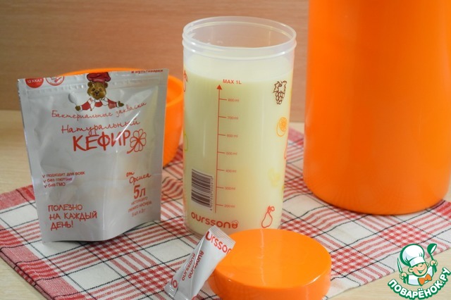 Приготовим кефир от Орсика: молоко подогреть до 24°С, вылить в емкость для сквашивания, добавить 1 пакетик закваски, емкость хорошо закрыть крышкой. Взбалтывать в течение 2-3 минут. В термос-йогуртницу налить кипяток до отметок, поставить емкость с молоком и закваской, закрыть термос и убрать в теплое место на 6-10 часов.