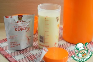 Приготовим кефир от Орсика: молоко подогреть до 24°С, вылить в емкость для сквашивания, добавить 1 пакетик закваски, емкость хорошо закрыть крышкой. Взбалтывать в течение 2-3 минут. В термос-йогуртницу налить кипяток до отметок, поставить емкость с молоком и закваской, закрыть термос и убрать в теплое место на 6-10 часов.
