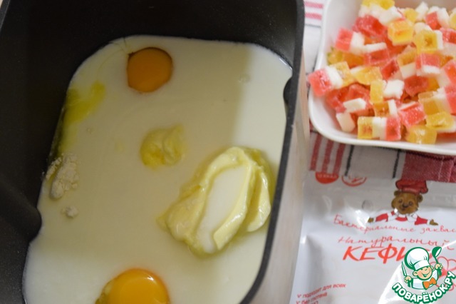 Мармелад мелко порезать. Все остальные продукты (кроме мармелада) заложить в ведерко ХП согласно инструкции.