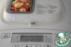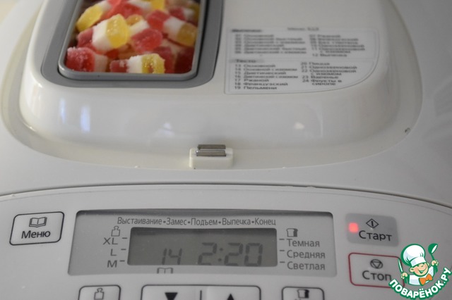Ведерко ставим в ХП, мармелад (если ХП с диспенсером, закладываем в него). Выбираем режим "Основное тесто с изюмом" (у меня 2 ч. 20 мин), нажимаем кнопку "Старт".