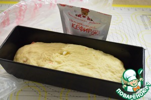 Выкладываем тесто на смазанный растительным маслом коврик, хорошо перебиваем, формируем булочку-кирпичек и выкладываем в смазанную форму (12 х 28 см). Закрываем пленкой и убираем в теплое место на 35-40 мин. для расстойки.