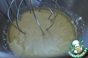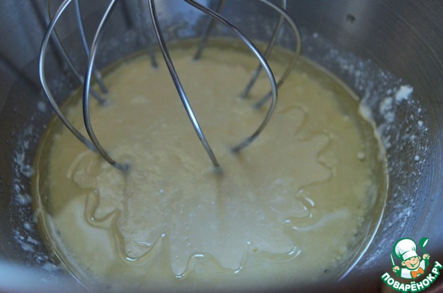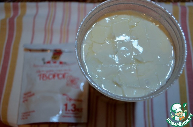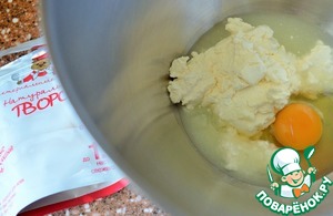 Взбить миксером 150г. творога, сыворотку, яйцо, сахар и ванильный сахар, соль. -