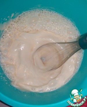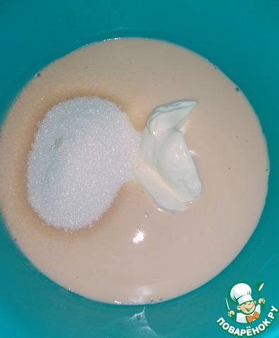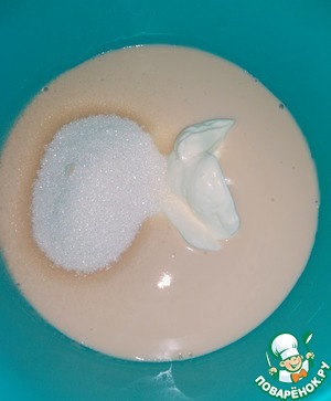 Ряженку 250 мл смешать со сметаной и сахаром.