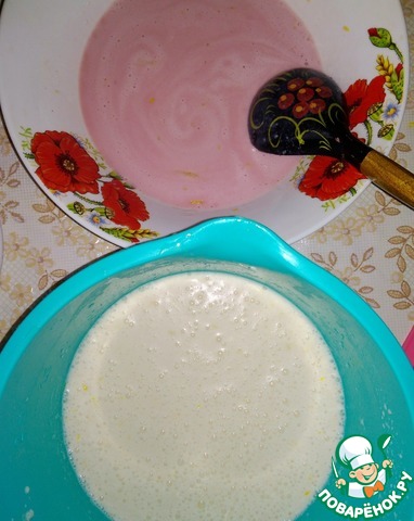 Отлить третью часть в отдельную чашу и добавить к ней клубничный сироп (у меня сироп от клубничного варенья- густой и насыщенный), получится масса розоватого цвета.