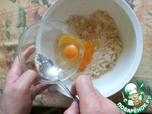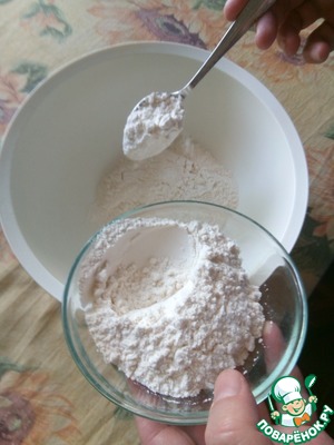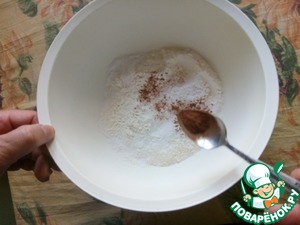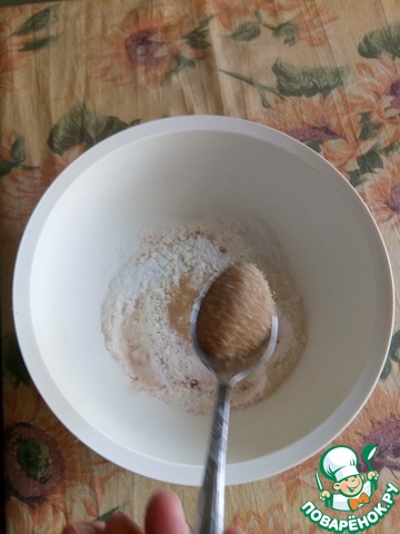В глубокой миске сначала смешиваем все сухие ингредиенты. Насыпаем муку