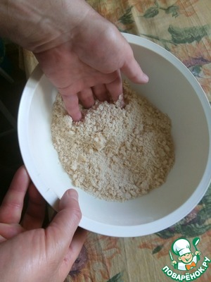 Режем на кубики сливочное масло. Оно не должно быть слишком мягким, ни слишком твердым, потому что его надо очень быстро перетереть руками вместе с сухими ингредиентами.