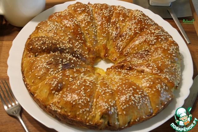 Смазываем яйцом, посыпаем кунжутом и ставим в разогретую до 180 градусов духовку на 30 минут до зарумянивания пирога.