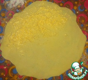 Раскатать в круг каждую часть теста достаточно тонко - 1-2 мм. Половину круга посыпать сыром.