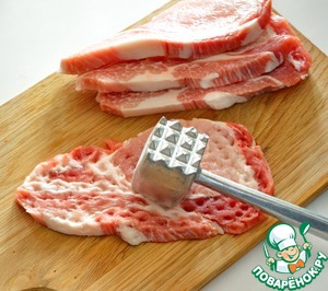 Свинину (корейку) нарежьте на куски толщиной 1 см и хорошо отбейте. Посыпьте солью