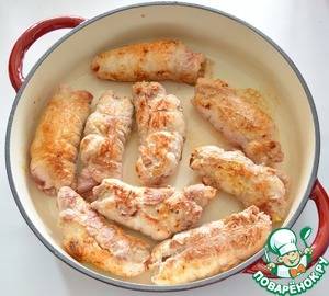 Раскалите в сотейнике масло, обжарьте с двух сторон рулады до золотистой корочки