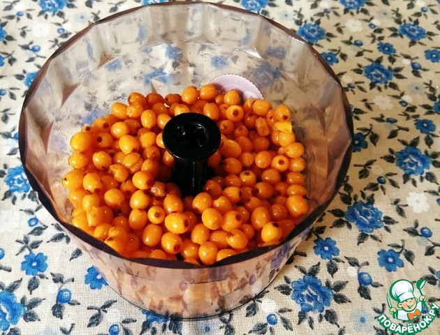 Измельчаю ягоды облепихи до однородного состояния. Я поделила ягоды на две части, так как во время измельчения масса увеличивается в два раза и сок может выступить из под крышки.