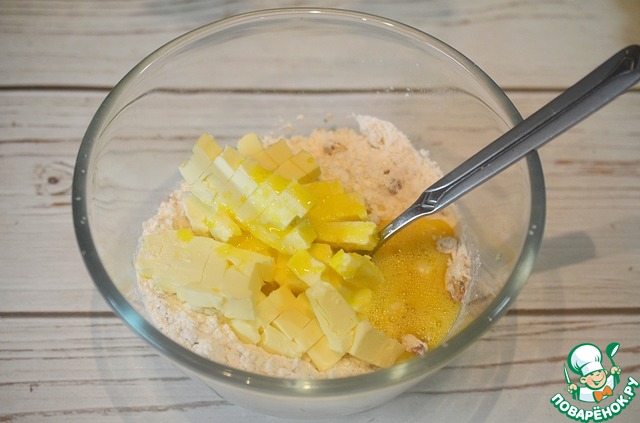• Добавьте масло к сухой смеси и перетрите все в крошку.