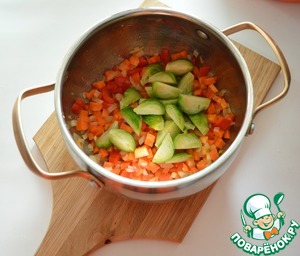 В кастрюле нагрейте масло и потушите слегка лук, морковь, перец и чеснок (около 5-7 минут), добавьте брюссельскую капусту