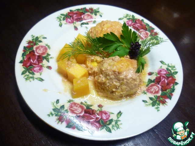 Подавайте курино-тыквенные тефтели в теплом виде со свежими овощами.