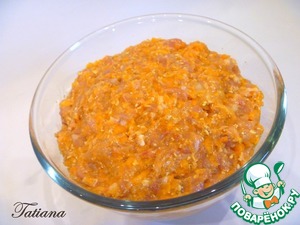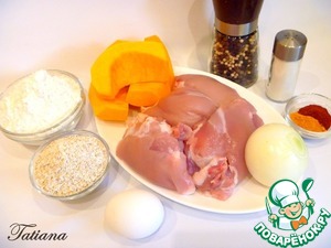 Куриное мясо хорошо промойте, просушите (привычным способом). Измельчите продукты (куриное мясо+тыкву+репчатый лук) для тефтелей в мясорубке с крупной решеткой. Добавьте соль, перец, яйцо, половину специй (куркума и паприка), овсяные хлопья (50 г.).