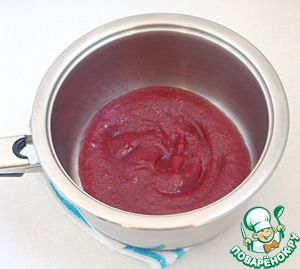 Для крема в маленькой кастрюле залить желатин холодным малиновым соусом. У меня быстрорастворимый желатин, потому я сразу поставила кастрюлю на средний огонь и, помешивая, нагревала до полного растворения желатина ( температура должна быть не выше 60 градусов).