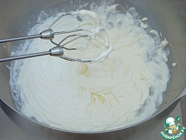 Взбивать до тех пор, пока сливки не станут жесткими пиками. |