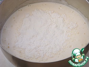 Просеять муку. Добавить 1/3 часть в яичную смесь и аккуратно перемешать лопаточкой, движениями снизу вверх.