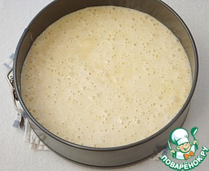 Выложить полученную смесь к основному тесту и аккуратно перемешать лопаточкой. Перелить тесто в заранее смазанную маслом разъемную форму диаметром 20 см, дно которой выложено бумагой для выпечки. Выровнять поверхность теста лопаточкой или обратной стороной ложки.