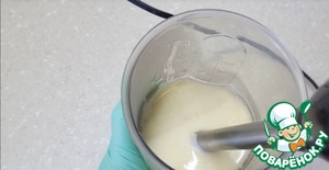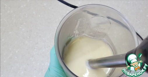 Пробиваем блендером с ножами. Держим его под углом, чтобы было как можно меньше пузырей.